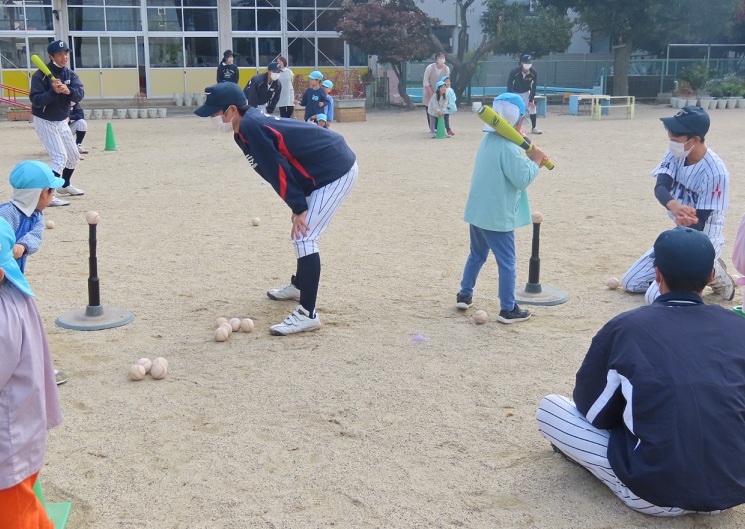 11月7日(金)10時から大津高校生による運動教室が開催されました。野球部員は大津市立平野幼稚園で「野球教室」、サッカー部員はOhMe屋上に新しくできたフットサルコートで、におの浜保育園児を対象とした「サッカー教室」に取り組みました。